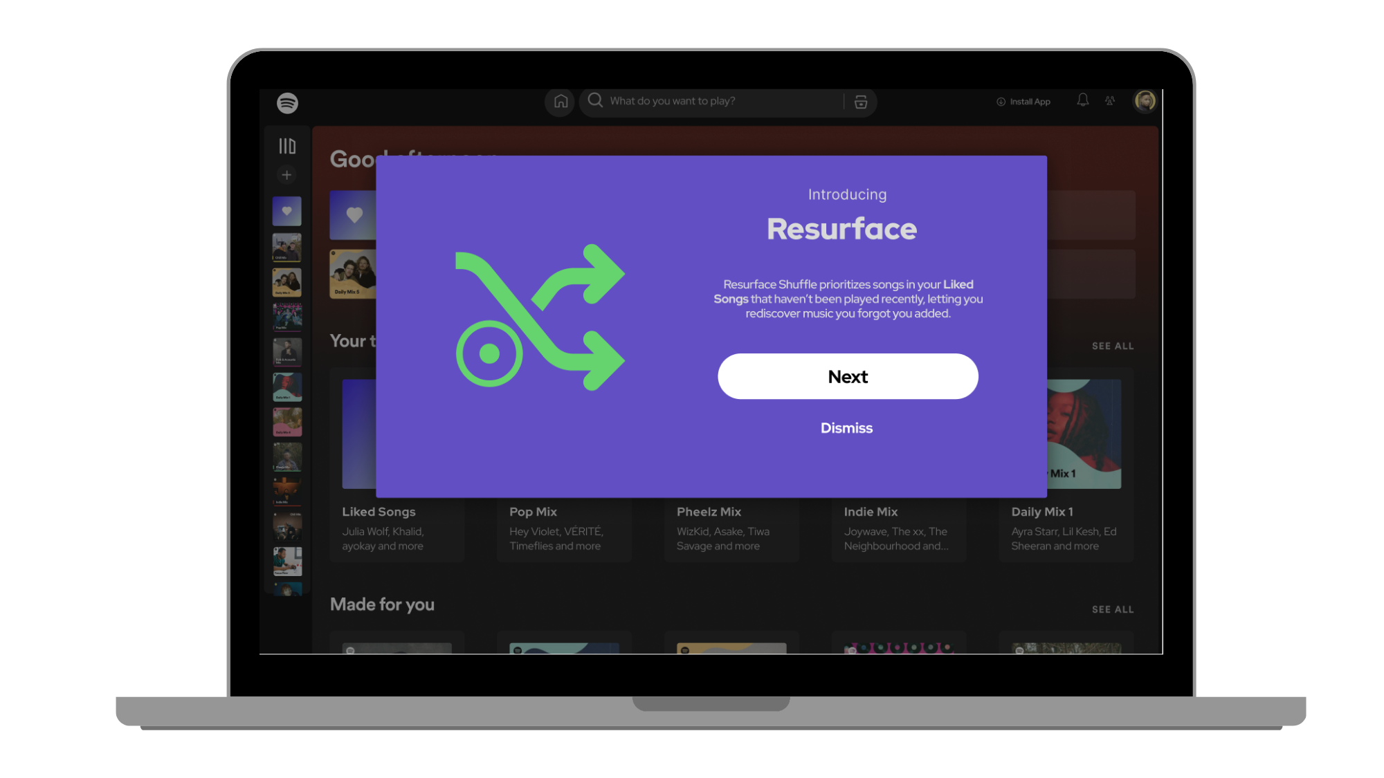 A smart shuffle mode for Liked Songs. Instead of randomizing the entire list, Resurface Shuffle prioritizes songs that haven’t been played recently. It gives users a fresh way to rediscover the music they once loved.