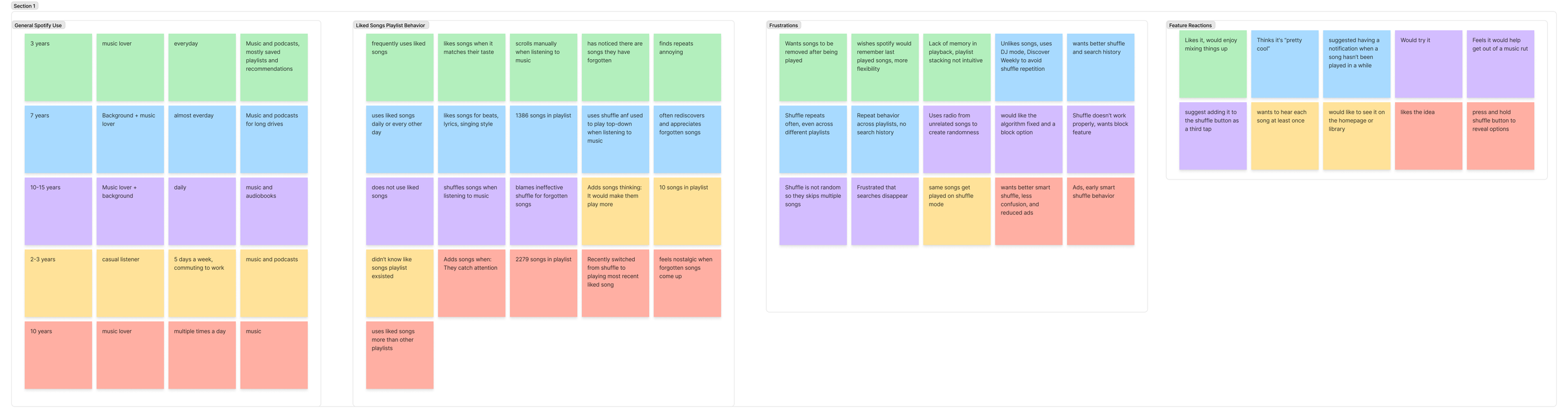 I conducted interviews with five Spotify users who regularly use the Liked Songs playlist. I wanted to understand how they use the shuffle function, whether they feel their music gets stale, and how they rediscover older songs in their library.